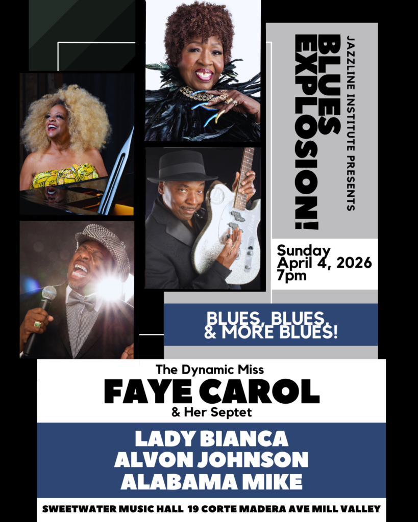 JaZzLine INSTITUTE presents Blues Explosion, a powerhouse lineup featuring four of the finest blues artists from the Bay Area and beyond. Get ready for blues, blues, and more blues as this slammin’ band and these renowned artists each raise the roof and let loose in their own unique style. Supported by the California Arts Council.