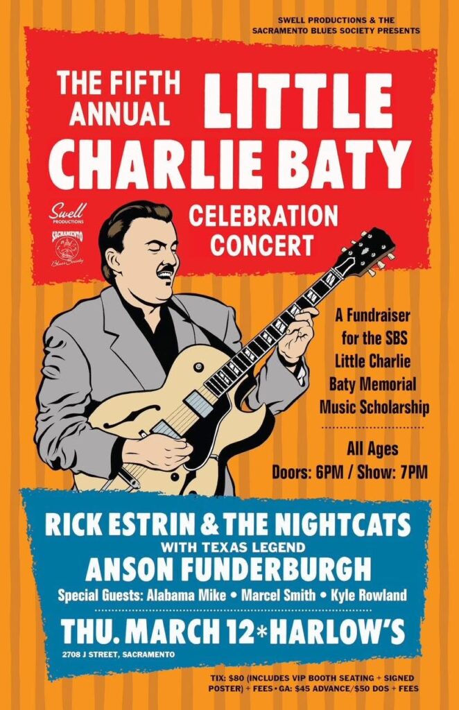 This is the 5th annual concert fundraiser for The Sacramento Blues Society Little Charlie Baty Memorial Music Scholarship.* Rick Estrin and the Nightcats, along with special guest Alabama Mike and the great Texas guitar player Anson Funderburgh, once again honors their friend.